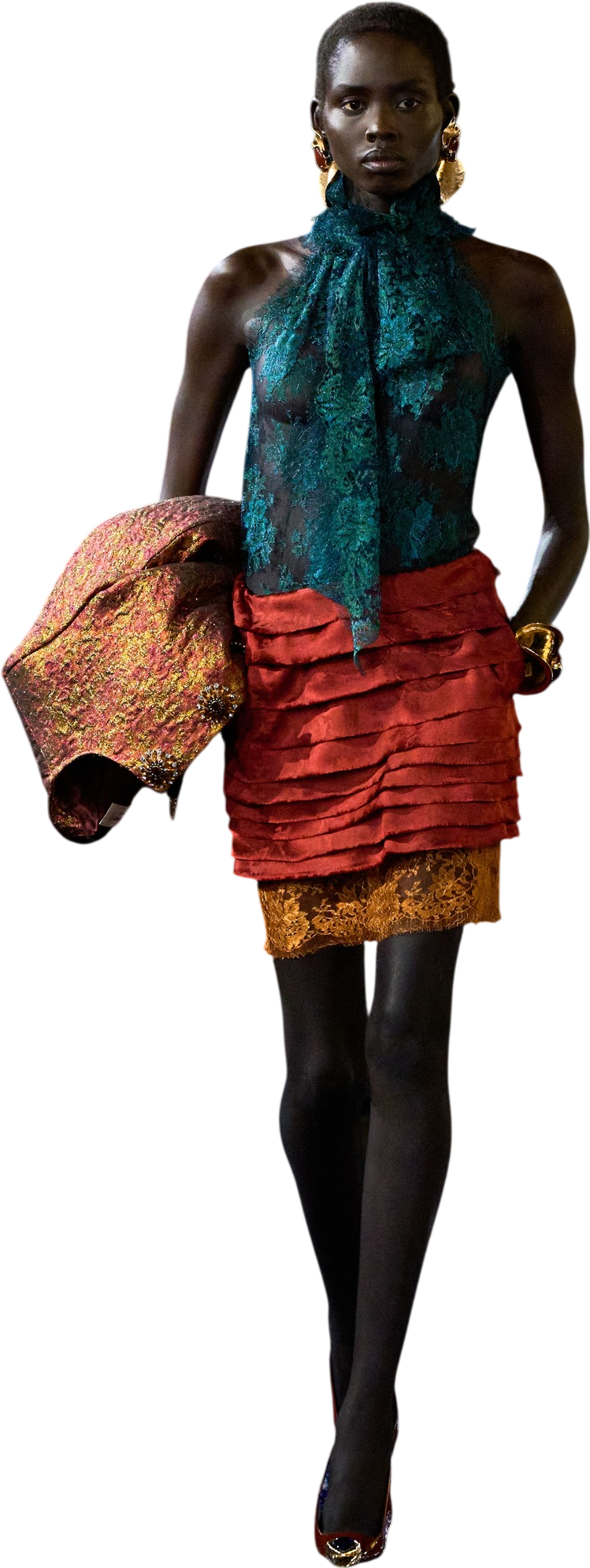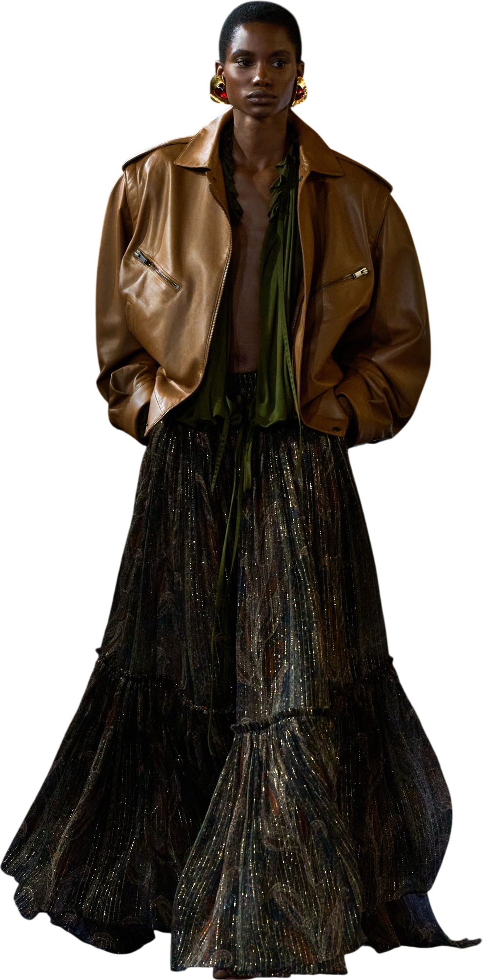 Chunky gold earrings and bangles, luxurious plunging silk necklines framed with ropes of weighty beaded necklaces (a tribute to Yves Saint Laurent’s dear friend and collaborator Loulou de la Falaise), supple leather jackets, and brazen fuchsias, citrus oranges, chartreuses, daffodil yellows and ocean blues all combined into what felt like an homage to all the great, unabashed women in Yves’s orbit and and true feast for the eyes.